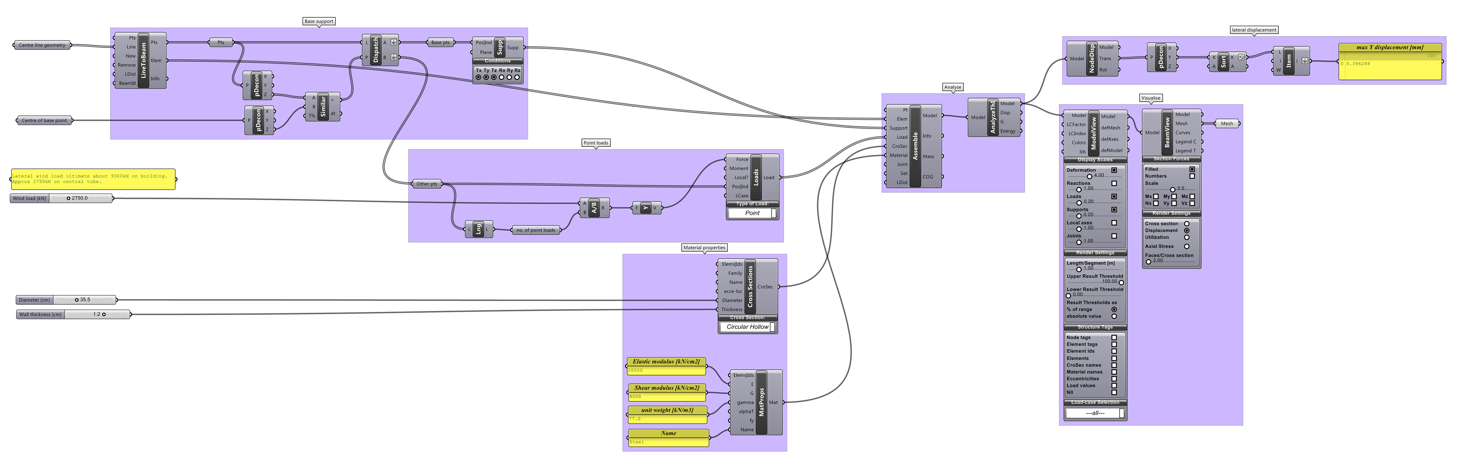 - The loads are then calculated. Since this script is only interested in lateral displacement and not say gravity, a wind load of 2750kN is applied evenly over the analytical points/nodes. This force is a vector in the Y-axis.