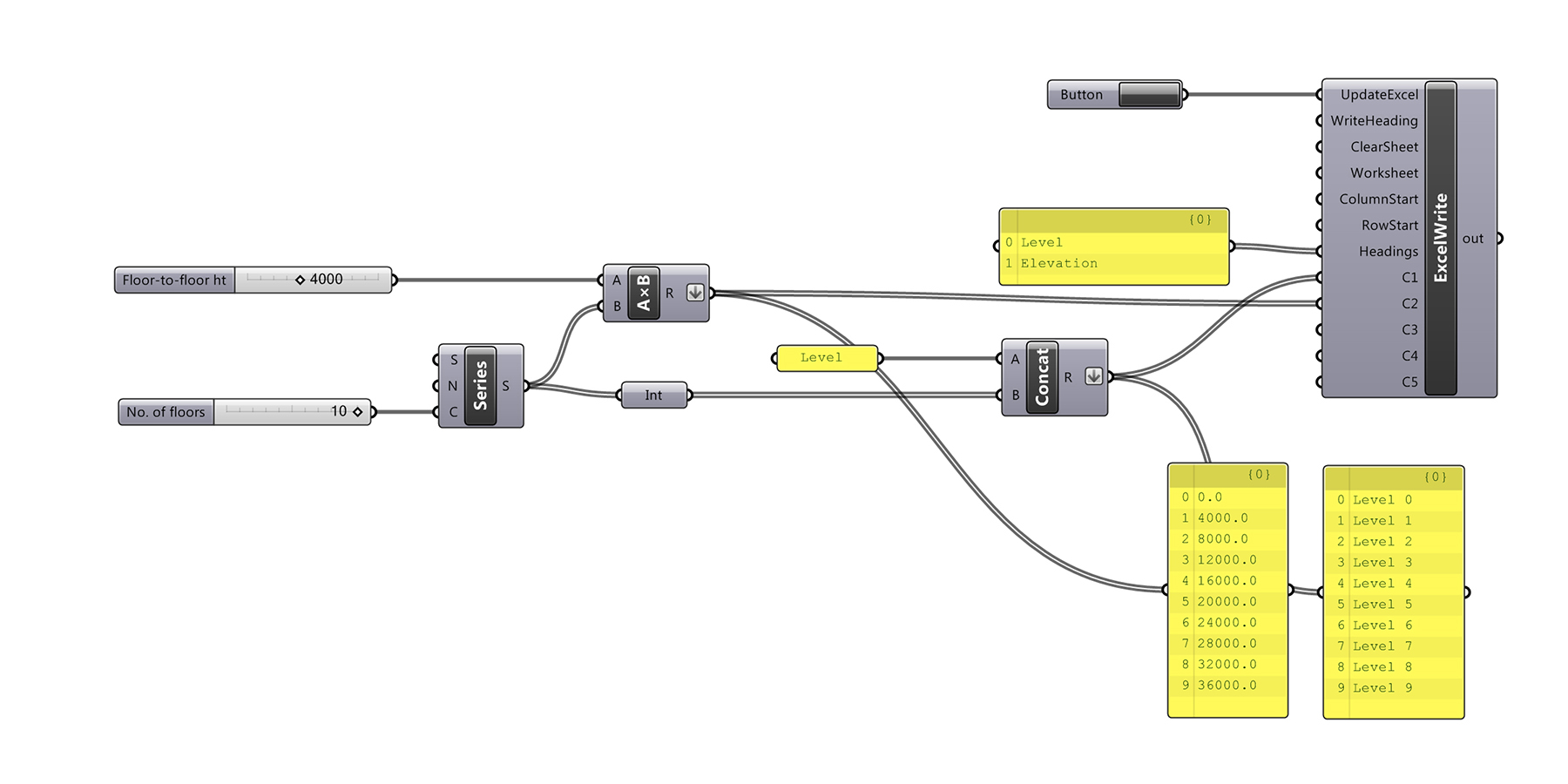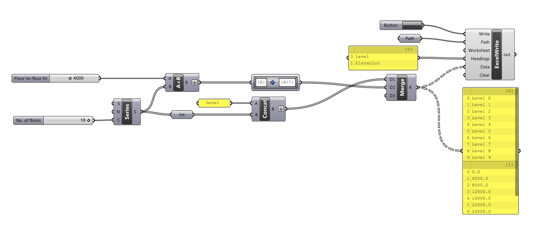 The first step is to generate a series of level names and elevations within Rhino/Grasshopper. The example below uses a series component to create the number of levels in the project. This list is then multiplied by the typical floor-to-floor height to get the elevations. If you’re building has atypical floor-to-floor heights, extract the Z-coordinates of the defining geometry which represents the levels. Next, we’ll use the concatenate component to name the levels. Both the elevations (number) and level names (string) can then be flattened and fed into the Lunchbox ‘ExcelWrite’ component.