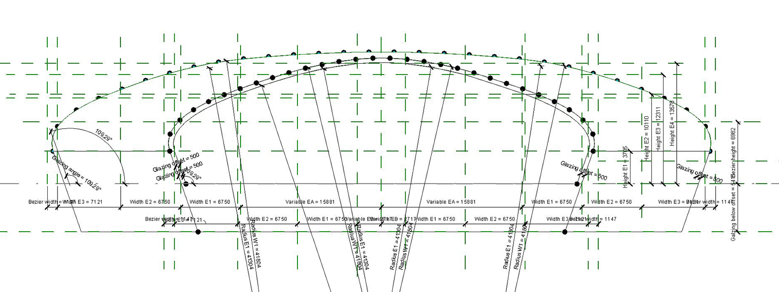 This process resulted in each bow truss and flat truss being standardised with only the middle truss varied to allow the building to taper in plan. Using a Revit generic model family, a series of type parameters were defined which allowed the truss to flex and the key setting-out points to be scheduled. Special attention was paid to the graphic representation of the complex geometry to aid legibility of the design intent.