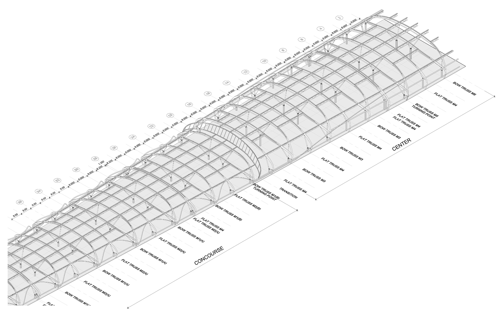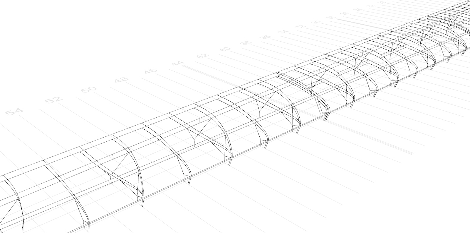 Initial conceptual design studies were first undertaken using McNeel’s Rhinoceros 5.0. These studies culminated in a wireframe model which defined the structural setting-out of the entire concourse. Due to a lack of computational skills within the project team, this was manually produced as opposed to using Grasshopper. Once the initial Rhino conceptual design studies were complete, the entire model was rebuilt from scratch using Autodesk Revit 2013. As it will be shown, this proved to be very tedious and ultimately unsuccessful, as Revit was unable to replicate the Rhino setting-out geometry, which was critical to the project.