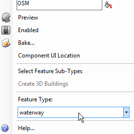 Next, we can use the OSM data component to start organising and collecting the data from the OSM file. The component defaults to selecting building elements but can be changed to choose from any of the other map features in the OSM specification by right-clicking on the component.