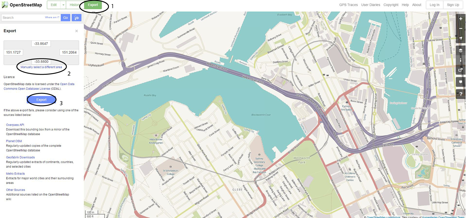 Before we can import any data into Grasshopper, we first need to export the data from Open Street Map (OSM). Once you have found your area of interest, select export up the top (1), then manually select a different area (2), then export (3). The export will create a file called ‘map.osm’ in your download folder which we can reference into Grasshopper.