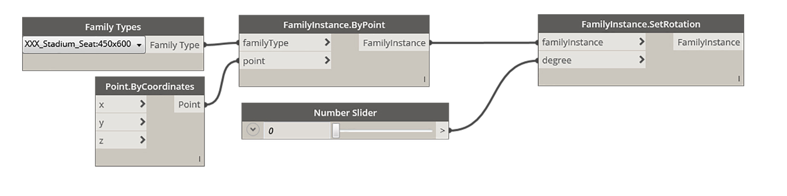 Since it is not possible to place a family instance with the correct rotation in one step, the node first places the seats using the ‘FamilyInstance.ByPoint’ node before setting their rotation. The seats need to be rotated so that they are perpendicular to the normal along the rows. To calculate this angle, the node uses the insertion points of the seat family and the polycurves to generate the parameters along the curve using the ‘Curve.ParameterAtPoint’ node. With these values, normals are then returned using the ‘Curve.NormalAtParameter’ node.