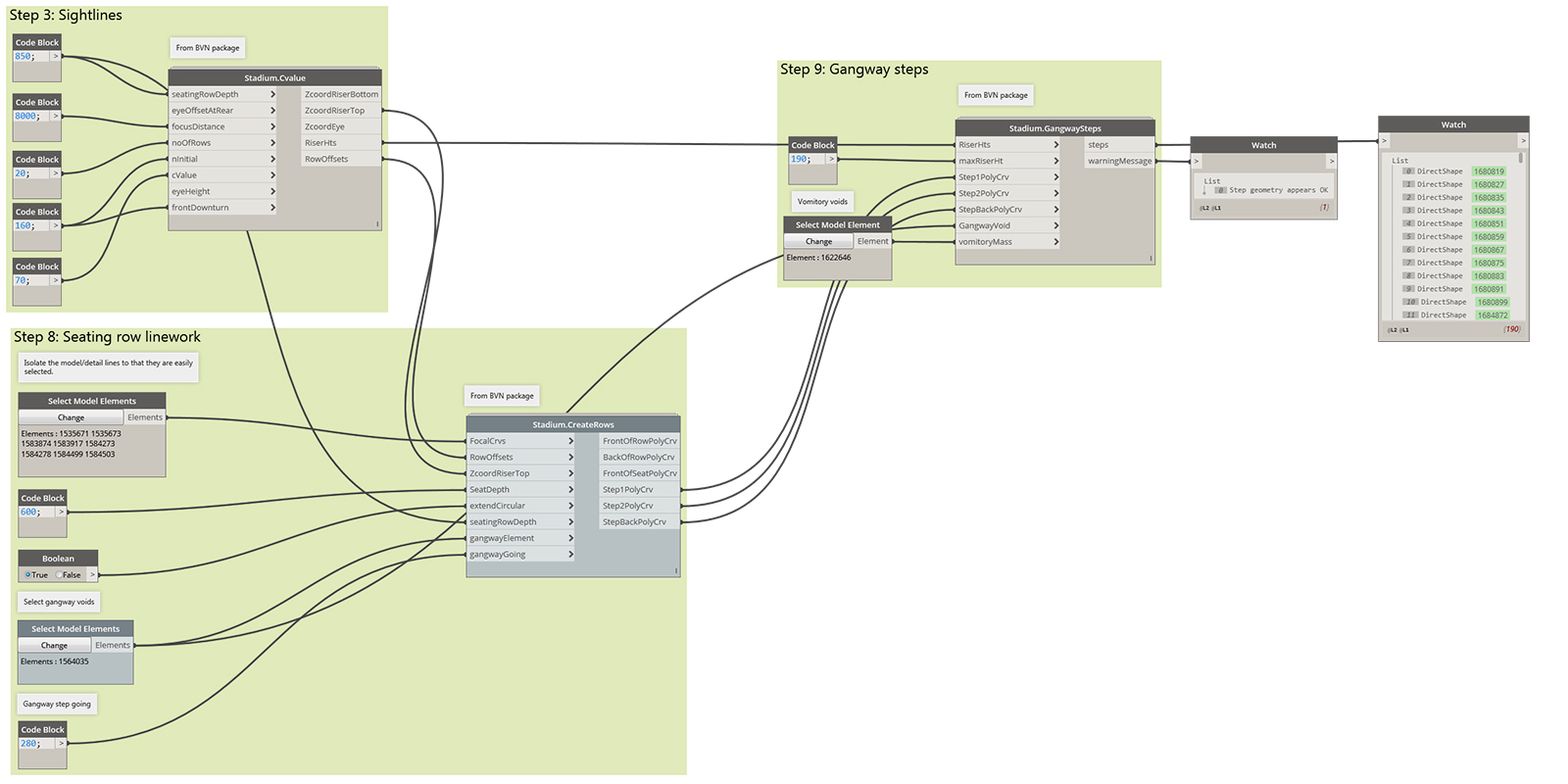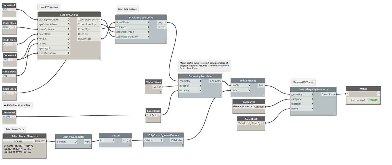 I am using this model as a learning exercise to see how Dynamo can be utilized within design. I am an emerging professional in the U.S. so I am still learning a lot about specific design considerations. I was able to reference the Green Guide about gangways and I found exactly what you mentioned in your post. I compared the output of this script to an existing stadium’s construction documents. I saw that the existing stadium had constant riser and seating heights so I became confused as to why that was the case. It now makes sense that with the C Value being constant would cause differentiation between seating heights. My best guess in regards to the existing stadium that I referenced is that the seating height was constant while the C value was operating within a certain tolerance. I think you were able to answer all of my questions. I really appreciate how helpful you have been! This script is truly incredible and well documented, I have learned a lot from it. Thanks again!