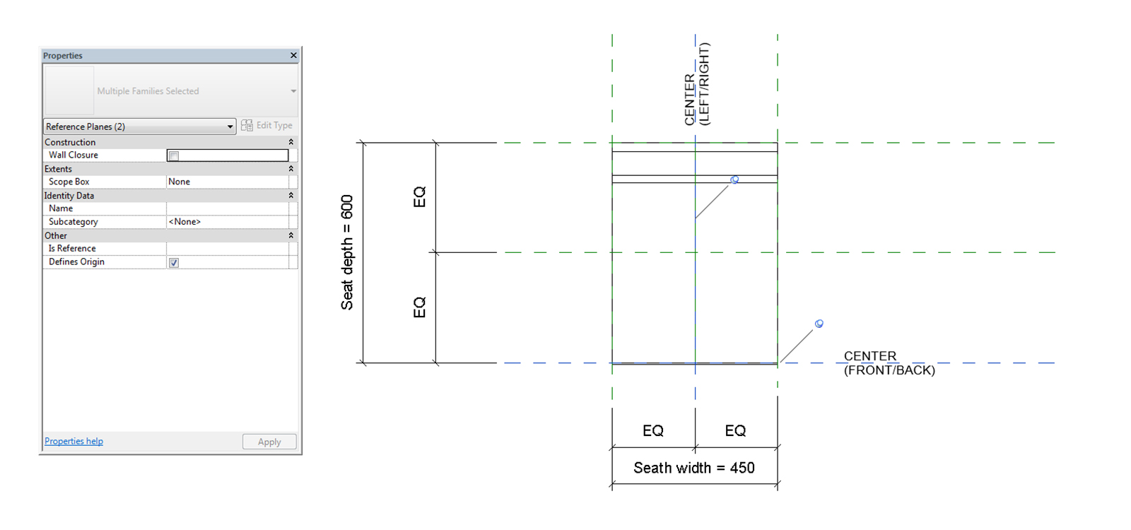 Before we place any seats, we need first to ensure our seat family is correct. When placing a family in Dynamo, Revit will use the insertion point as defined by the ‘Defines Origin’ parameter within the family. The example below shows how the reference planes have been modified and renamed so that the centre (front/back) and centre (left/right) align with the front of the seat.