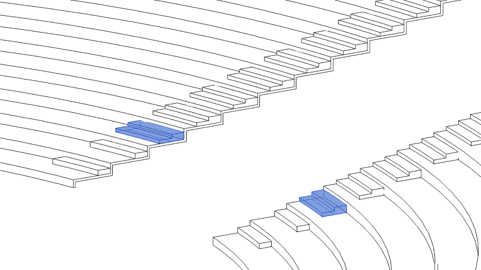 Using the curves from the previous step and the riser heights from Step 3, we can create the gangway steps. The number of steps will vary depending on the row riser height. Section 12.11 of the Green Guide (p.115) states that: