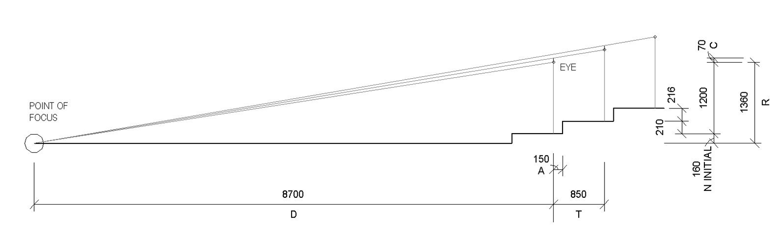 D = Seating step width (T) – eye offset from rear of row (A) + focus distance (F)