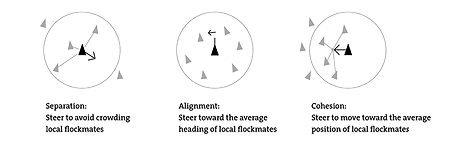 Flocking is the collective motion of a large number of self-propelled entities and is a collective animal behaviour exhibited by many living beings such as birds, fish, bacteria, and insects. It is considered an emergent behaviour arising from simple rules that are followed by individuals and does not involve any central coordination. Flocking behaviour was simulated on a computer in 1987 by Craig Reynolds with his simulation program, Boids. This program simulates simple agents (boids) that are allowed to move according to a set of three basic rules: