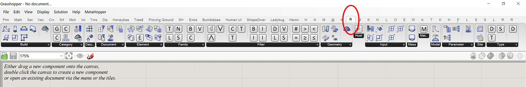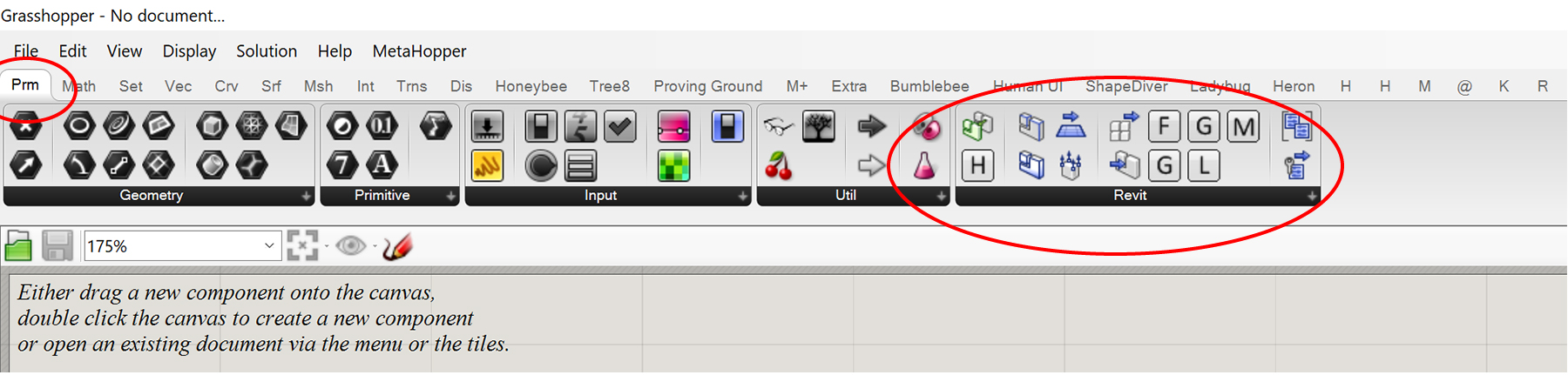In Revit, go to the Rhino.Inside tab. Press the Rhino icon to launch Rhion.Inside Revit. This will activate the other icons in the ribbon. Next, press the Grasshopper icon to launch Grasshopper inside Revit. Within Grasshopper you should see Rhino.Inside Revit components added under the ‘Params’ and ‘Revit’ tabs. Note that these components are only visible from within Rhino.Inside Revit. If you open Rhino 7 independently, you’ll notice that these components are not available. Therefore, if you try to open a Grasshopper file in Rhino 7 after you have placed Rhino.Inside Revit components, you’ll receive an error saying the components are missing and the file won’t work correctly.