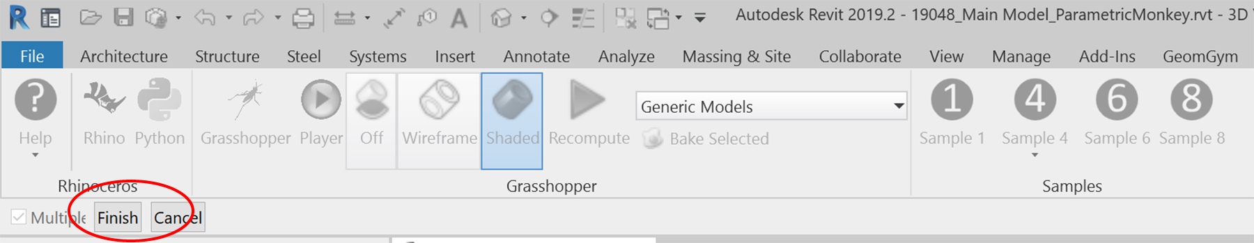 It can get a little tricky managing three windows – Revit, Rhino and Grasshopper – at the same time. If one of the windows disappears, simply press the Rhino or Grasshopper button within Revit’s ‘Rhinoceros’ tab.