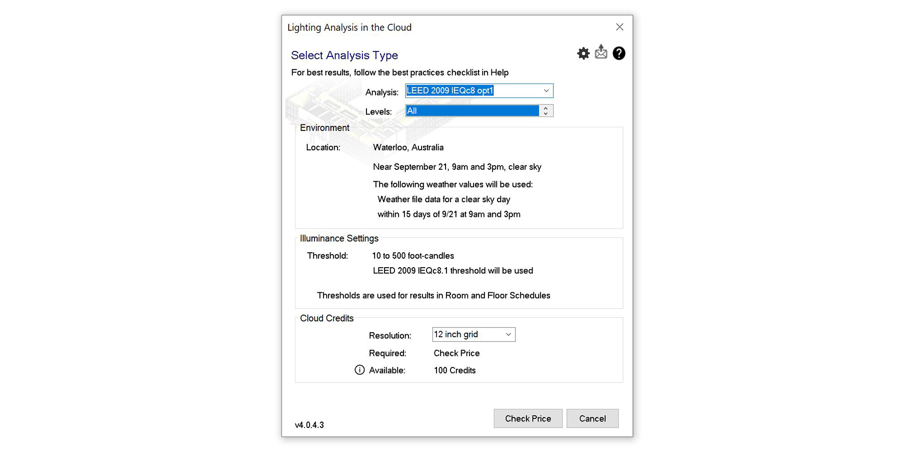 Insight is broken down into two parts – lighting and solar – and is based on the underlying analysis engine. Anything under ‘Solar’ uses the Perez sky model calculation for solar insolation and is beyond the scope of this tutorial. Conversely, anything located under ‘Lighting’ uses the A360 rendering engine and is an illuminance-based analysis.