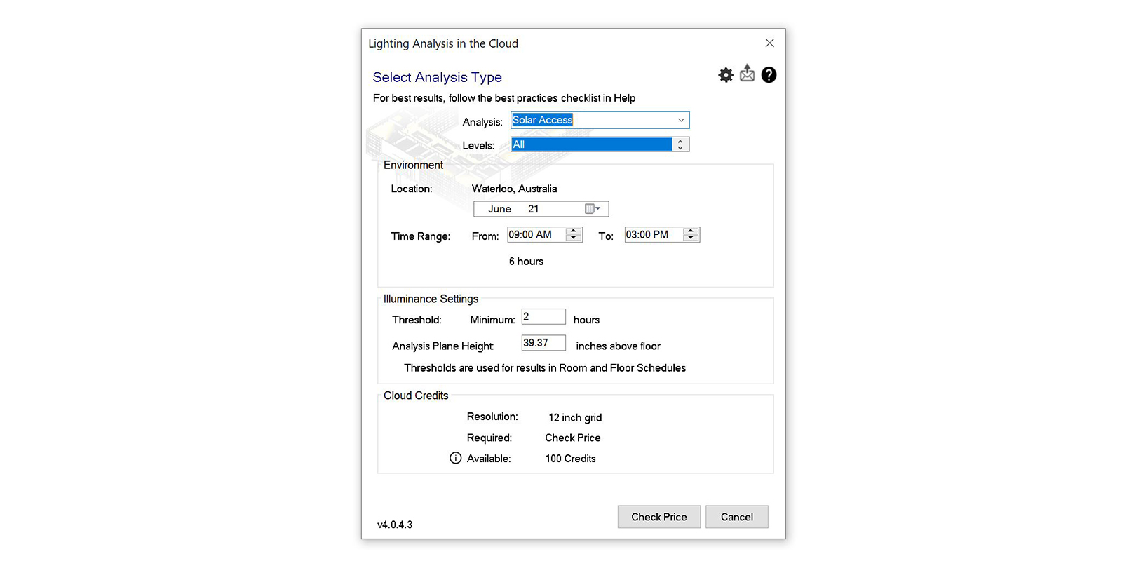 The solar access setting is the one which best approximates the SEPP65 solar access requirement in Australia. The date should be modified to 21 June and the time range set to 9 am to 3 pm. Depending on your specific location in NSW, the threshold will either be 2 hrs for Sydney Metropolitan Area and in the Newcastle and Wollongong local government areas, or 3hrs for all other locations.
