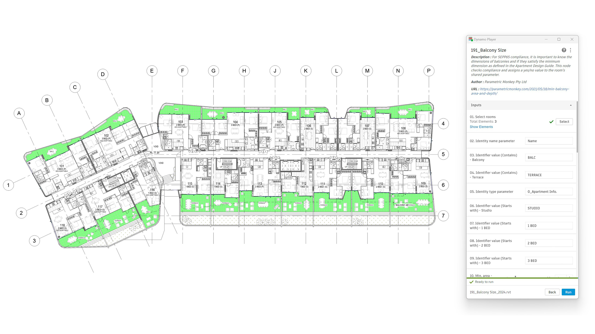 When designing apartments, often it is necessary to know the area and dimensions of balconies for planning compliance. However, to make things difficult, these requirements are often based on the apartment’s dwelling type and/or location. This tutorial demonstrates how to automate the compliance process, such as that required by SEPP65 and the Apartment Design Guide, by verifying the minimum balcony area and depth.