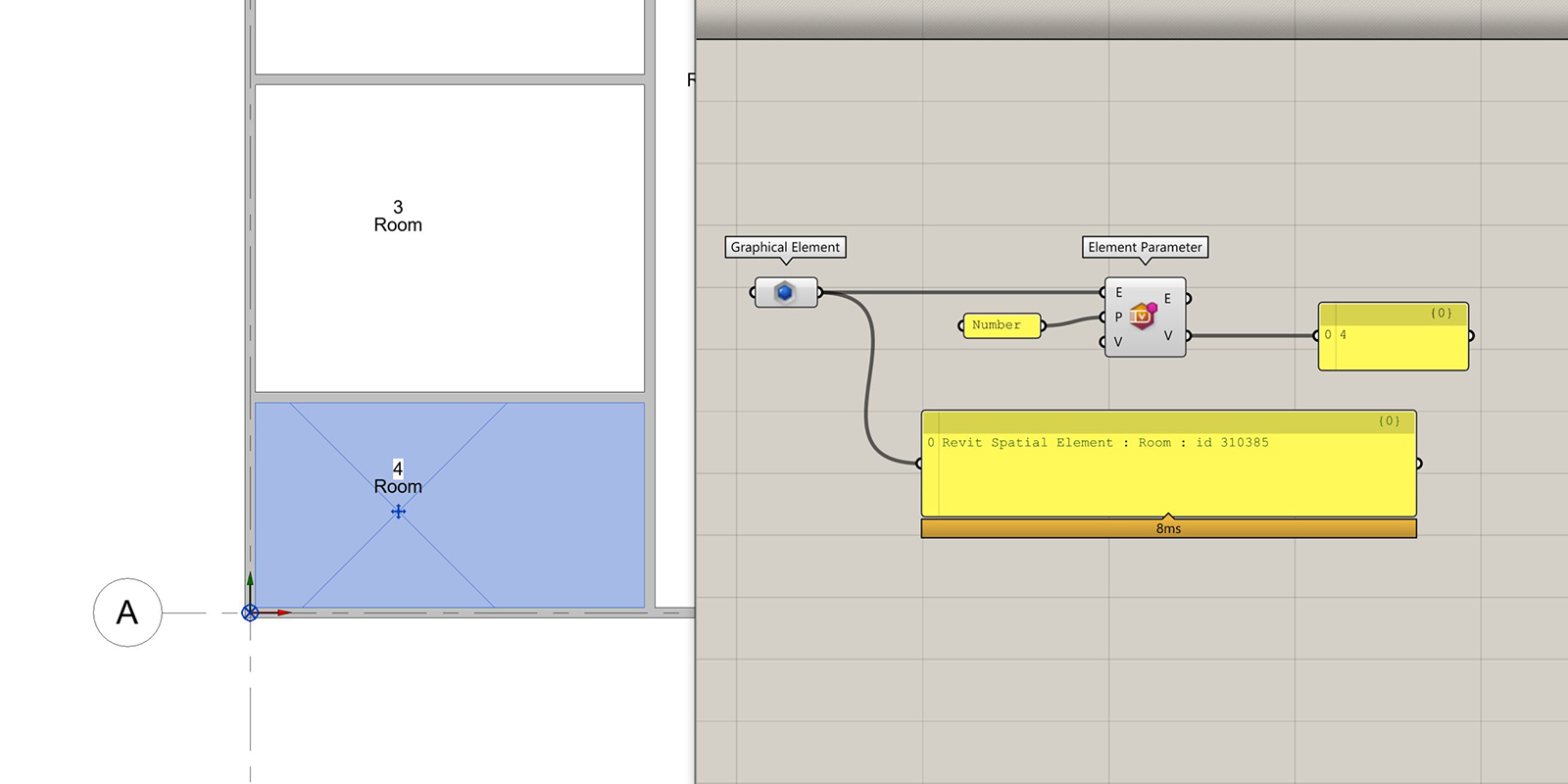 Take for example the ‘Element Parameter‘ (Revit > Element > Element Parameter) component. The first input parameter is the Revit element that this component deals with; in this case, we’re using a room. Next is the parameter to query/modify. If the value input is empty, the component will query the element’s parameter, in this case, returning a room number of ‘4’.
