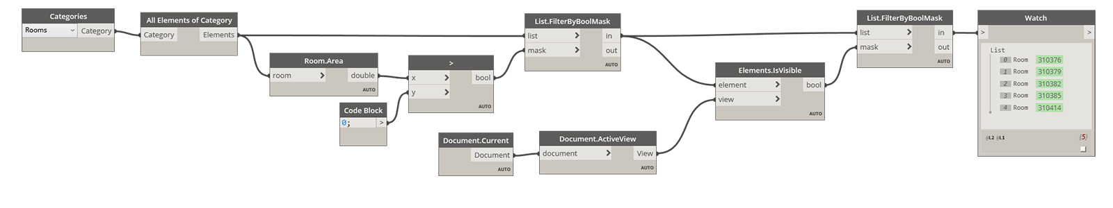 One of the valuable features of Rhino.Inside Revit is the use of filters. Take, for example, collecting all rooms within a project. In Dynamo, users will be accustomed to collecting all elements by category (Rooms) and then applying a series of conditional statements (such as room area is greater than 0) and progressively filtering out elements.