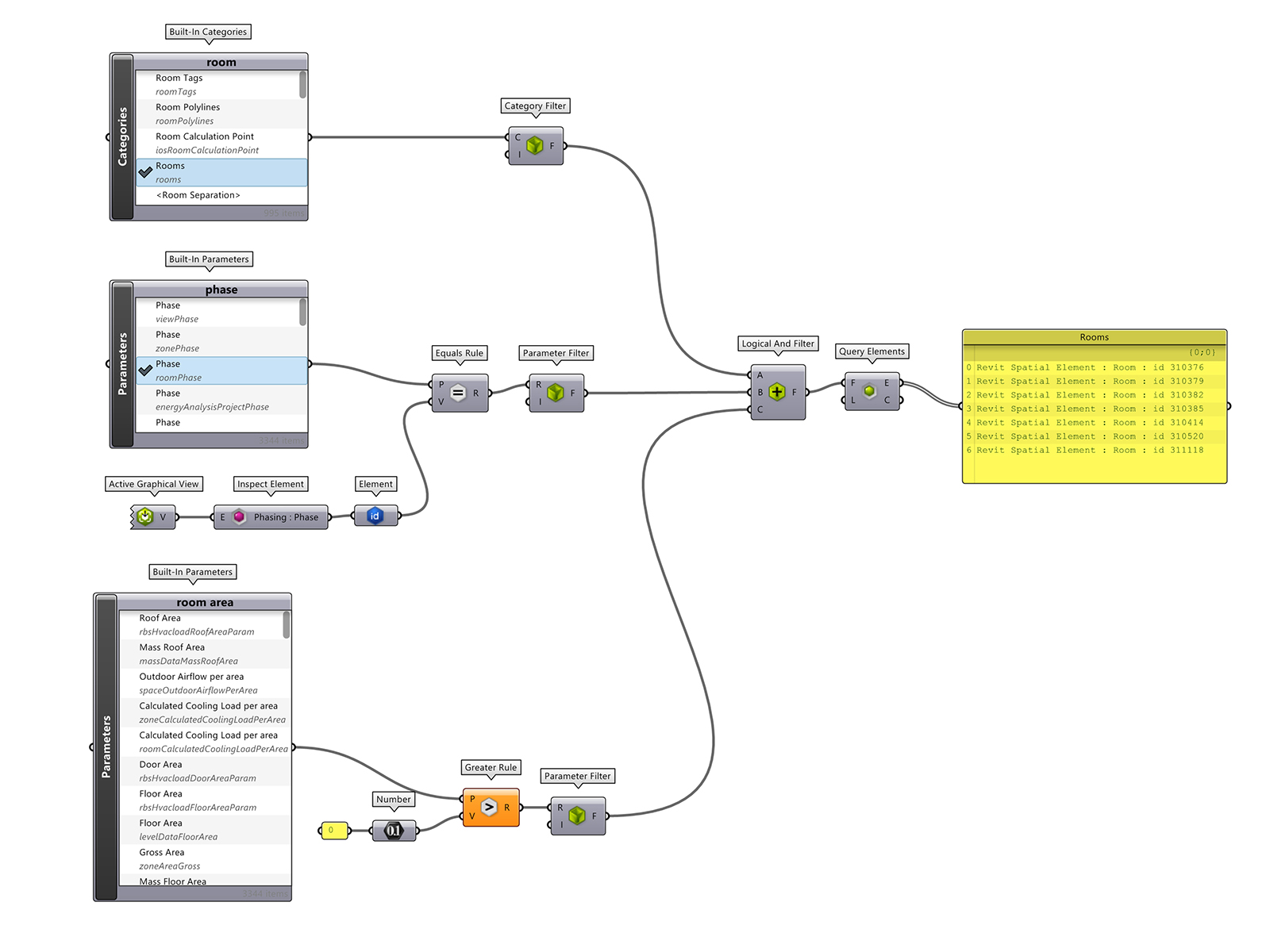 However, in Rhino.Inside Revit, we can create a series of filters and combine them into a Logical AND filter, which is a much more efficient way of collecting elements. In the example below, there is one filter for category (Rooms), another for phase (based on active view), and finally, area (for placed rooms only).