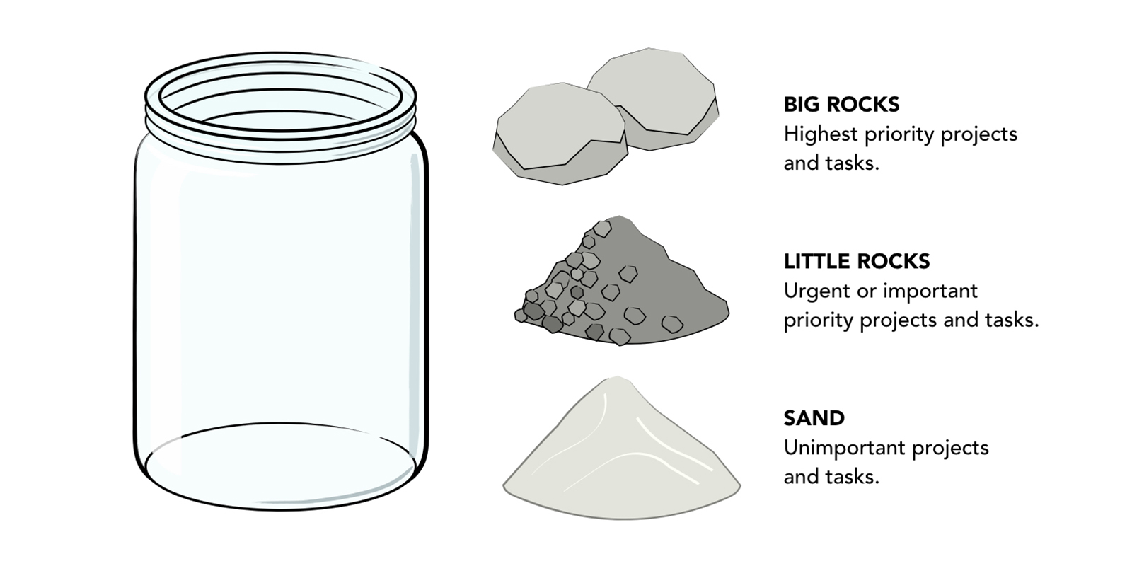Say you have some rocks, a bunch of pebbles, and some sand, and your goal is to fit as much of everything as you can into a wide-mouth jar. If you start with the sand and then the pebbles, the jar will run out of room for all the rocks. But when you start with the rocks, add the pebbles, and save the sand for last, the sand fills the space between the rocks, and everything fits.