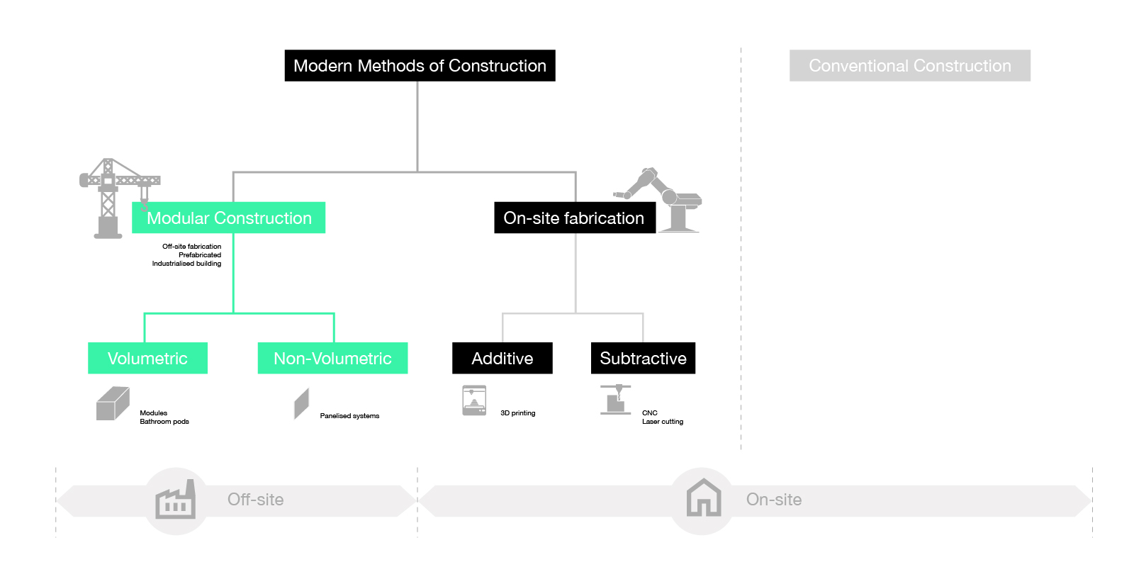Whereas Conventional construction uses raw materials in situ, modular construction embraces off-site prefabrication in a factory. In other words, it represents a shift away from construction towards manufacturing. Modular construction falls under the umbrella term Modern Methods of Construction, which acknowledges that fabrication can occur both off-site and on-site, as is the case with 3D printing and other processes.