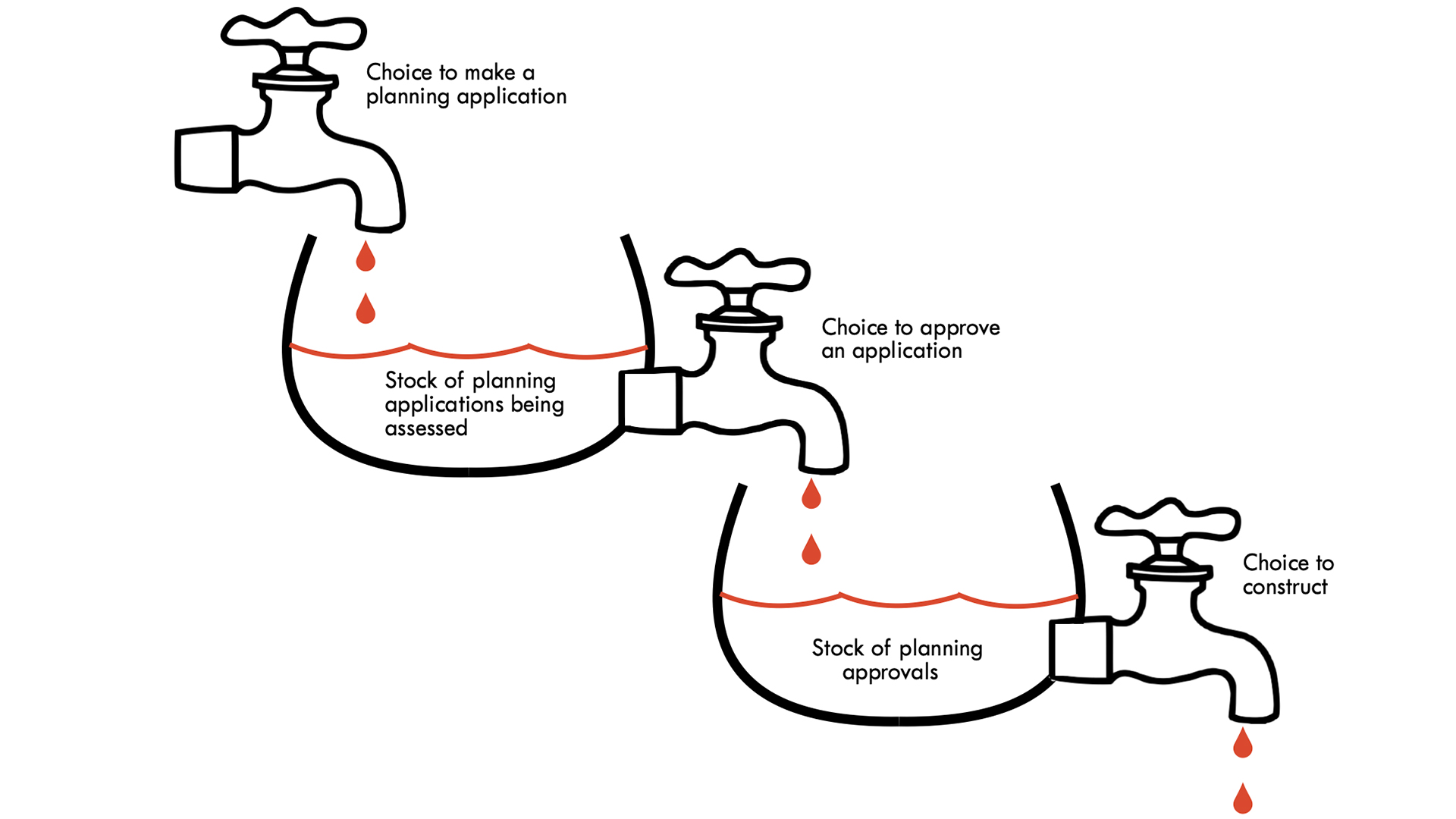 - There is no mechanism that forces more new housing onto the market just because the planning system has created a different set of development options for landowners. Planning approvals have routinely exceeded dwelling construction, and developers regularly reduce the rate at which they supply housing even when they hold surplus planning approvals.