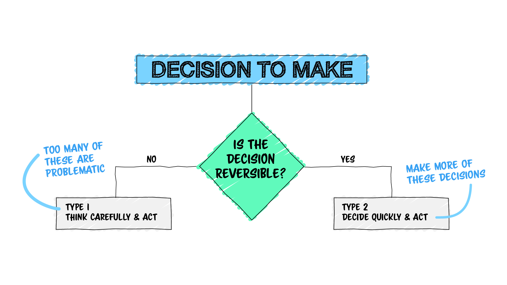 Jeff Bezos, the founder of Amazon, describes that one of the most common pitfalls for large organisations is one-size-fits-all decision-making. He makes the distinction between what he terms Type 1 decisions and Type 2 decisions: